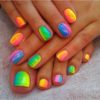 - Когда все ногти будут покрыты градиентом, не дожидайтесь его высыхания и покройте все бесцветным лаком;